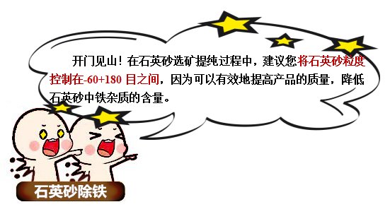 因此在石英砂選礦提純過程中,首先要把原料進(jìn)行水洗脫泥,然后將石英砂粒度控制在-60+180目之間,來有效地提高產(chǎn)品的質(zhì)量,降低石英砂中鐵雜質(zhì)的含量。對粒度大于60目和粒度小于180目的石英砂可加強(qiáng)磁選,這樣可以有效降低石英砂中鐵雜質(zhì)的含量。
