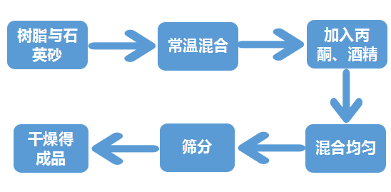 首先對石英砂粉體進行必要的擦洗和干燥,然后利用樹脂或高聚物等對石英砂粉體表面進行“覆膜”,表面涂敷改性通常分為冷法涂覆和熱法涂覆兩種。熱法相比冷法來說,效果更好,適用于大量生產,但需專門的混砂設備。