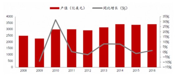 全球半導(dǎo)體市場經(jīng)過2015年的短期衰退之后,市場開始回暖,產(chǎn)值規(guī)模有所增加。2015年產(chǎn)值規(guī)模為3348億美元。2016年全球產(chǎn)值規(guī)模達(dá)3397億美元,同比增長1.5%。隨著市場供求關(guān)系轉(zhuǎn)換以及新興技術(shù)與應(yīng)用領(lǐng)域的驅(qū)動,產(chǎn)值規(guī)模將持續(xù)成長。
