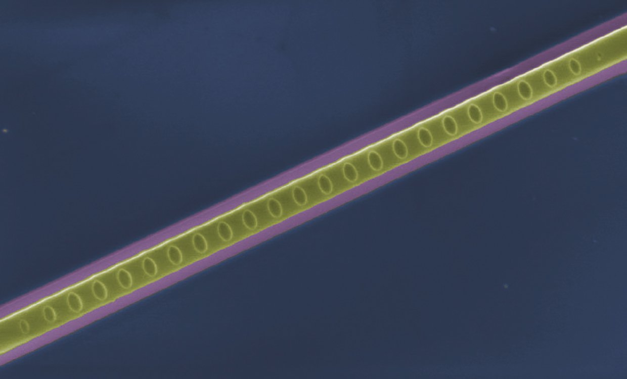 圖片來源:NIST/Nature Communications. 在這幅假彩色掃描電鏡圖中,單個光子從二氧化硅表面(藍)上的波導(粉)中穿過。