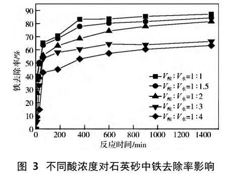 鐵去除率隨著時間延長和酸濃度增高而變大;鐵去除率曲線可以分為三個階段:10-60min斜率較大,反應激烈;60-360min斜率減小,反應放緩;3601440min斜率趨近零,反應極其緩慢。即酸液濃度增大會推動反應的正向進行,激活更多的活化分子,提升除鐵率,但濃度過高會迅速生成產物層限制反應進行,鐵去除率增幅變緩。