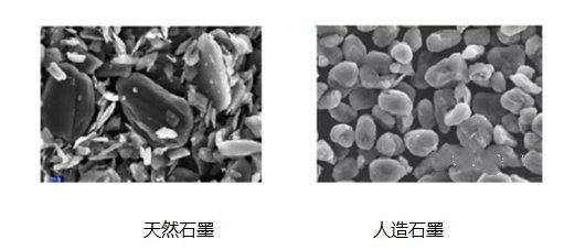 從上圖中就可以看出天然石墨和人造石墨在形貌上的區別。