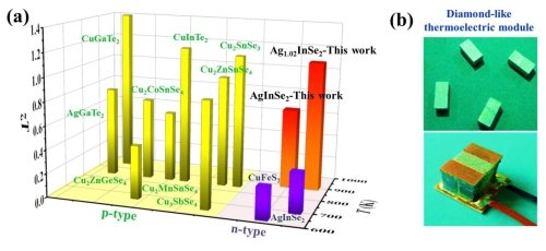 圖1.(a)n型AgInSe2類金剛石結構化合物熱電優值;(b)首個類金剛石結構化合物熱電器件