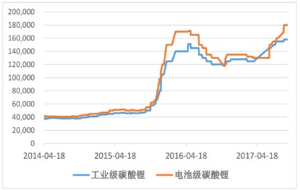 碳酸鋰主要應用于陶瓷、玻璃、鋰電池等行業,分為電池級和工業級碳酸鋰。工業級碳酸鋰的需求比較穩定,每年增長為個位數。而電池級碳酸鋰占比約為 40%,隨著近幾年新能源汽車的快速增長,電池級碳酸鋰的需求年復合增長可達50%以上,拉動的了碳酸鋰的價格和需求的整體上漲。而隨著電池級碳酸鋰的需求持續增加,國內碳酸鋰的供需仍存在缺口,隨著鹽湖提鋰的技術逐步完善,鹽湖提鋰仍將持續擴產,大部分于新增產能將于 2019年至2020年期間建成到達產,所以預計到 2020年國內碳酸鋰供需將實現平衡。