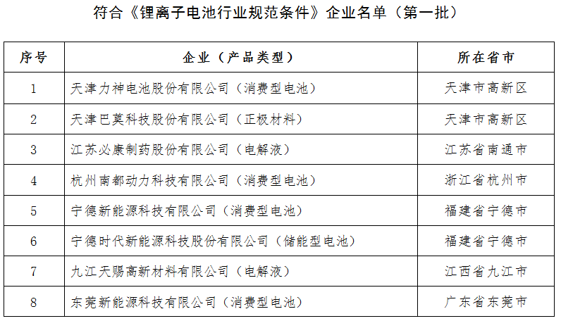 2017年4月17日,工信部公布了符合《鋰離子電池行業規范條件》企業名單(第一批),8家企業入選。其中,寧德時代新能源科技股份有限公司作為唯一的儲能型電池企業入選。