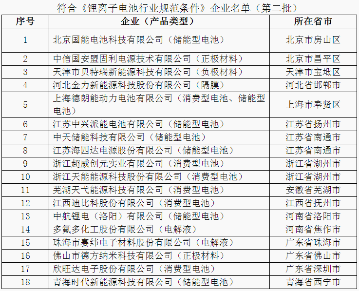 中國粉體網訊 1月15日,工信部公布符合《鋰離子電池行業規范條件》的企業名單(第二批),多氟多、欣旺達、國能電池、盟固利動力、中興派能、中航鋰電等18家鋰電企業進入名單。