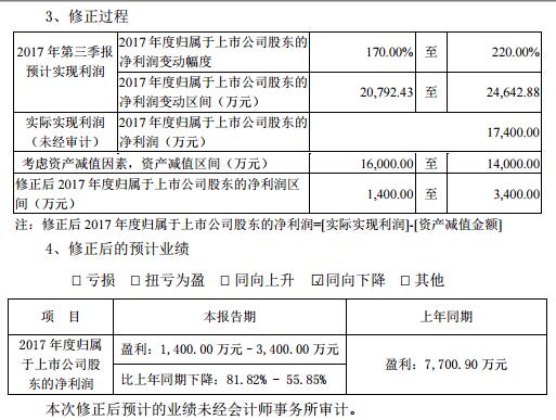 今日,天際股份修正2017年度盈利1400萬元-3400萬元,同比下降81.82%-55.85%。此前,第三季度報告中預計2017年度盈利20792.43萬元-24642.88萬元,同比增長170%-220%。