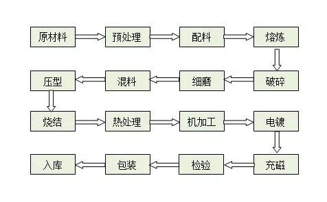 目前我國主要用燒結法(粉末冶金法)生產燒結釹鐵硼永磁材料,主要過程如下: