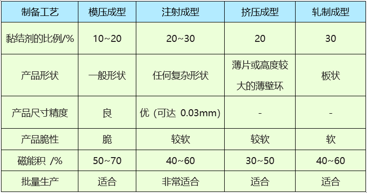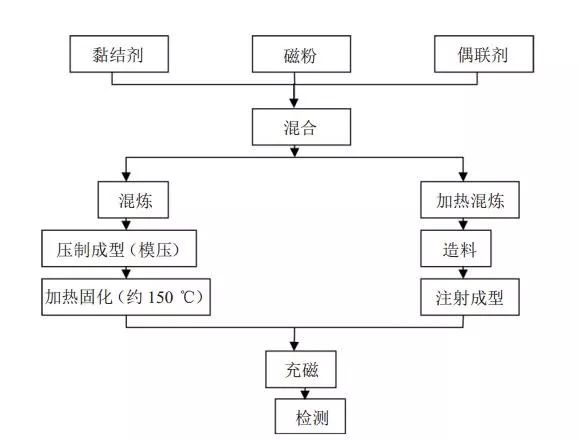 在黏結Nd-Fe-B磁體生產中壓制成型和擠出成型所占的比例越來越大,它們的工藝流程如下圖,其黏結工藝工序簡單,成型精確,不需后加工。