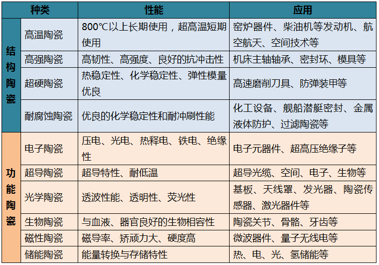 按性能和用途,先進(jìn)陶瓷可分為功能陶瓷和結(jié)構(gòu)陶瓷兩大類。功能陶瓷主要基于材料的特殊功能,具有電氣性能、磁性、生物特性、熱敏性和光學(xué)特性等特點,主要包括絕緣和介質(zhì)陶瓷、鐵電陶瓷、壓電陶瓷、半導(dǎo)體及其敏感陶瓷等;結(jié)構(gòu)陶瓷主要基于材料的力學(xué)和結(jié)構(gòu)用途,具有高強(qiáng)度、高硬度、耐高溫、耐腐蝕、抗氧化等特點,主要包括氧化物陶瓷、氮化物陶瓷、碳化物陶瓷、硼化物陶瓷等。