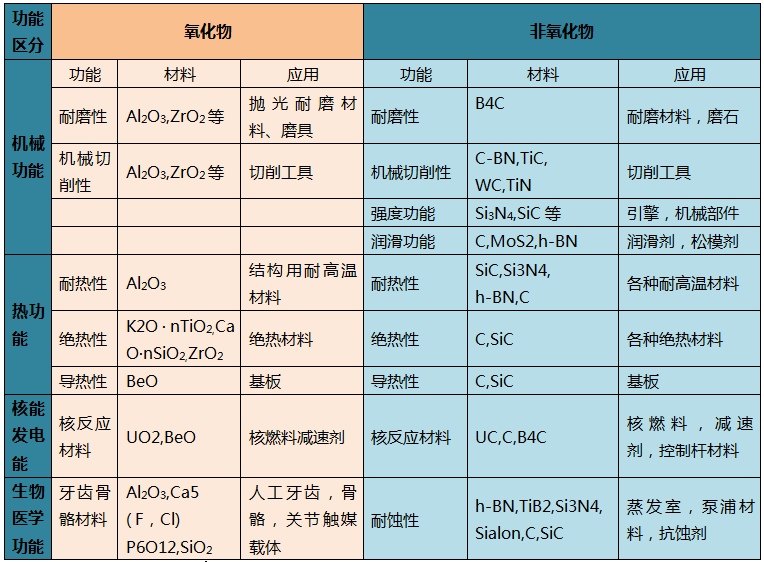 先進(jìn)陶瓷應(yīng)用性能分類
