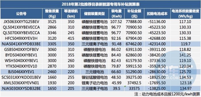 電車匯檢索2018年第2批推薦目錄中13款新能源專用車(均為純電動物流車),結合2018年補貼標準,以1200元/kwh的價格測算出補貼后動力電池成本(不同類型、不同能量密度的電池價格存在差異,在此僅供參考),發現很難說磷酸鐵鋰電池在整備質量、能量密度、裝電成本等方面存在明顯優勢。