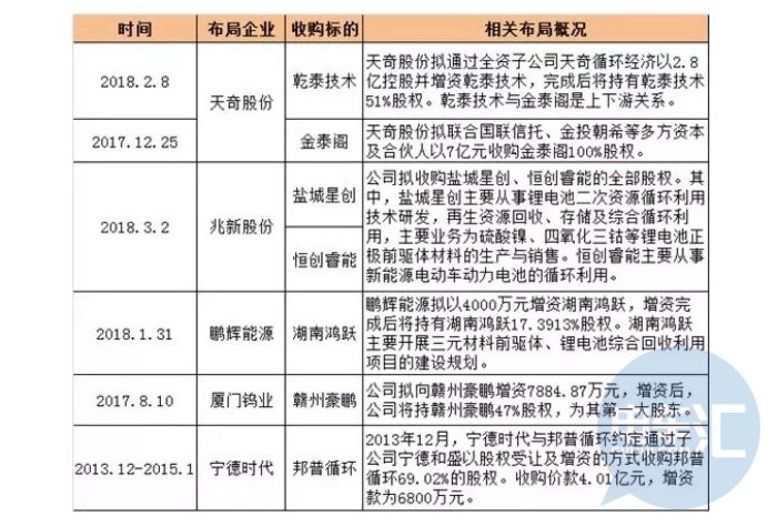 除了邦普循環、贛州豪鵬兩大回收領軍企業相繼被寧德時代、廈門鎢業控股后。近期,鵬輝能源、兆新股份、天奇股份都擬通過資本市場將湖南鴻躍、鹽城星創、恒創睿能、金泰閣、乾泰技術等第三方電池回收企業收入囊中。