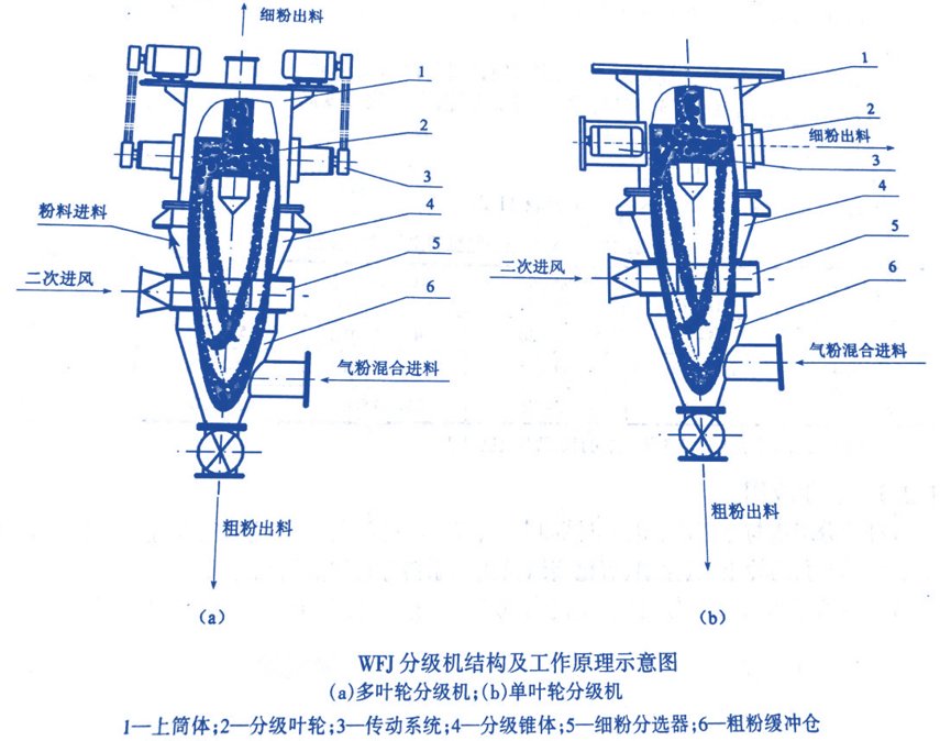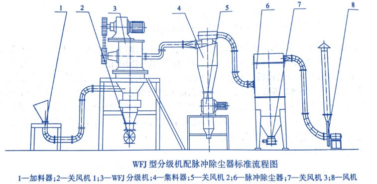 WFJ型分級機與球磨機、超細機械沖擊磨、氣流粉碎機等配套或單獨設置。已廣泛應用于滑石、重鈣、高嶺土、氧化鋁、氧化鎂以及化工原料等粉體的精細分級。