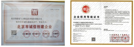 北京瑞德克氣力輸送技術股份有限公司是一家專業提供工業智能化固體物料氣力輸送系統、噴吹系統及配料成套解決方案的環保科技型上市企業(證券代碼:838937)。公司現為國家級高新技術企業、中關村高新技術企業,中國石灰協會理事單位、中國鹽業協會、中國電器工業協會鉛酸蓄電池分會、中國機械工程學會物流工程分會管道物料輸送技術專業委員會會員單位。公司已通過中華人民共和國特種設備設計許可證(壓力容器)審核,及質量管理體系ISO9001:2015,環境管理體系ISO14001:2015,職業健康安全管理體系OHSAS18001:2007復審,并榮獲北京市誠信創建企業及企業信用3A證書。