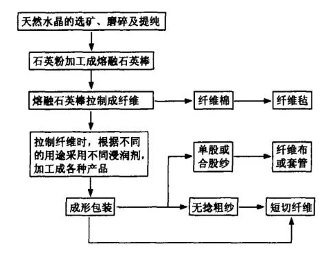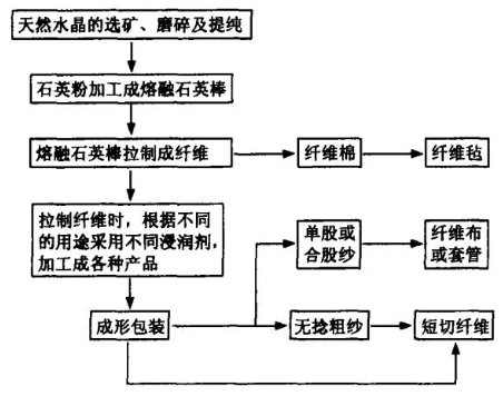 石英玻璃纖維一般是由純的天然水晶提煉加工成熔融石英玻璃棒拉制而成。在拉制過程中,加熱的方式有氫氧火焰法和等離子體法,根據用途的不同,涂覆相應的浸潤劑。石英玻璃纖維的產品有直接無捻粗紗、有捻紗(包括單股和合股紗)、纖維布、纖維套管、短切纖維、纖維棉、纖維氈和纖維磚等。石英玻璃纖維各種產品的生產工藝流程如下: