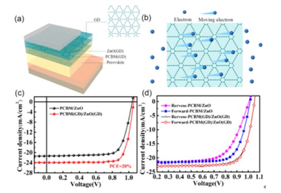 圖1.(a),鈣鈦礦太陽能電池器件結構示意圖;(b),石墨炔化學結構及其電子傳輸示意圖;(c),鈣鈦礦太陽能電池電流-電壓曲線;(d),電池在不同掃描方向的器件行為。