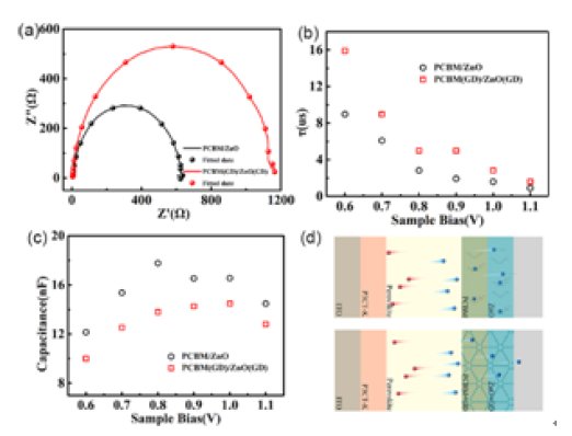 圖2. (a),電池阻抗曲線;(b),電池在不同偏壓下的電子壽命;(c),電池在不同偏壓下的電容;(d),石墨炔器件作用機理圖。
