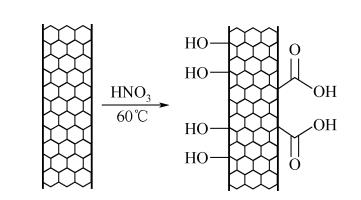利用碳納米管的端頭及彎折處易被氧化斷裂,同時轉化為羧基、羥基的特點,采用濃酸或者稀酸處理,使其兩端或彎折處開口,引入羥基、羧基等官能團,如圖所示,進而增大碳納米管與溶質間的親和力,提高其在溶質中的分散性。