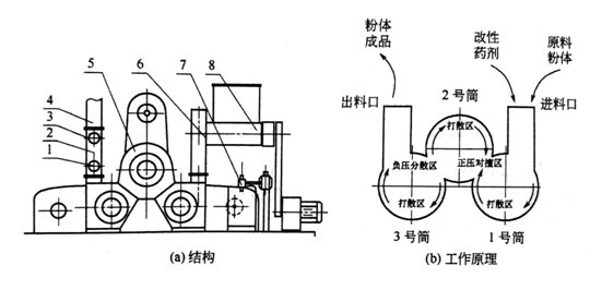 集成沖擊、剪切和摩擦力,通過改變氣旋渦流等作用對粉體和改性劑進行高強度分散并強制粉體與表面改性劑的沖擊和碰撞;在粉體與轉子、定子沖擊摩擦過程中在有限腔內產生改性劑與粉體顆粒表面作用所需溫度;利用變向渦流氣旋的紊流作用增加顆粒與表面改性劑的作用機會和確保作用時間。