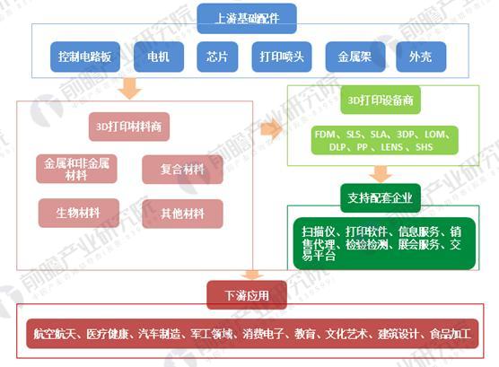 整個3D打印行業產業鏈大概可分為:上游基礎配件行業;中游3D打印設備生產企業、3D打印材料生產企業和支持配套企業;下游主要是3D打印的各大應用領域。通常意義上的3D打印行業則主要是指3D打印設備、材料及服務企業。