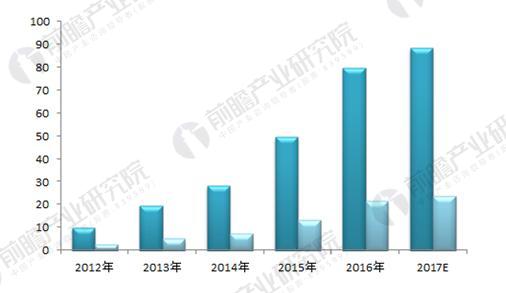 圖表5:2012-2017年中國3D打印材料市場產值變化情況(單位:億元)