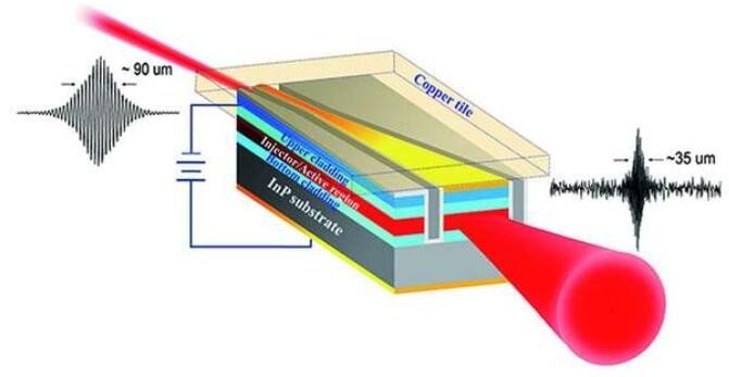 針對這一科學問題,中科院蘇州納米所張子旸課題組與中科院半導體所劉峰奇、王占國實驗室合作利用調(diào)制摻雜的多層量子點結(jié)構(gòu),打破了傳統(tǒng)半導體寬光譜光源中輸出光譜寬度與輸出功率相互制約的關(guān)系,成功地研制出了近紅外波段高輸出功率>20 mW、同時寬光譜>130 nm的量子點SLD (如圖1所示);隨后又利用子帶間躍遷的量子級聯(lián)材料為增益介質(zhì),采用寬譜光源與光放大器單片集成的器件結(jié)構(gòu),實現(xiàn)了國際上第一支室溫連續(xù)工作的中紅外量子級聯(lián)SLD(如圖2所示),這一進展填補了中紅外波段室溫連續(xù)工作半導體寬光譜光源的空白。這些研究成果為提高目前近紅外OCT系統(tǒng)的性能,實現(xiàn)多年前理論預(yù)言的中紅外OCT系統(tǒng)奠定了材料及器件基礎(chǔ)。