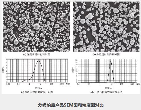 從粒度分布圖中可以看出,分級后產品的粒度分布比分級前產品的粒度分布窄了很多,從粒度分布圖中可以看出,一些粒徑很小的顆粒已經被分離出去了。