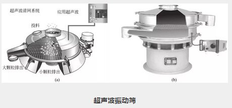 將超聲波控制器與振動篩有機結合在一起即超聲波振動篩,在篩網上面疊加一個高頻率低振幅的超聲振動波,粉體接受巨大的超聲加速度,使篩面上的物料始終保持懸浮狀態,從而抑制黏附、摩擦、平降、楔入等堵網因素,性能較振動篩更為優異。