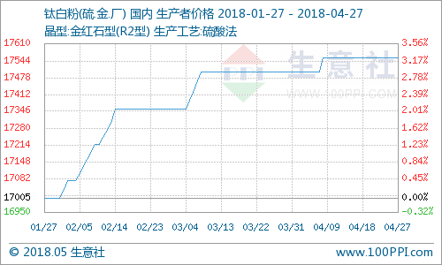 中國粉體網(wǎng)訊 價(jià)格走勢:以國內(nèi)市場走貨量較大的硫酸法金紅石型鈦白粉為例,據(jù)生意社大宗榜數(shù)據(jù)顯示,本周(4月23日-4月27日)鈦白粉總體平均價(jià)企穩(wěn),平穩(wěn)于17555元/噸,漲幅為0%。