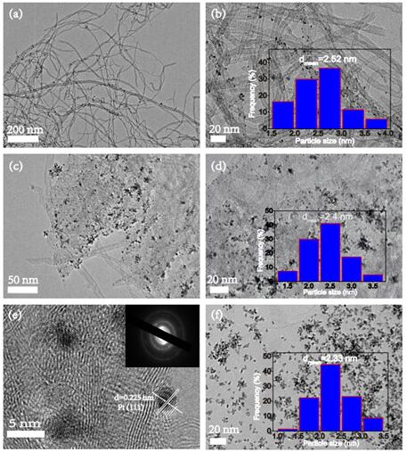 圖1 (a-b) Pt/CNTs的TEM圖; (c-e) Pt/GNTs的TEM圖; (f) Pt/rGO的TEM圖
