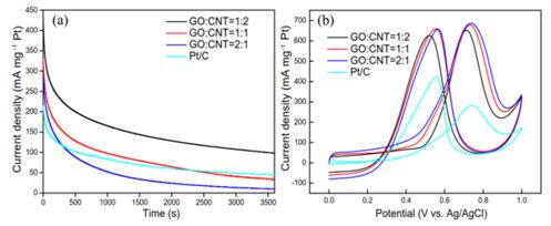 研究人員將氧化石墨烯(GO)與碳納米管(CNTs)自組裝后形成一種三維結構,然后負載鉑,并通過氫等離子放電可以得到具有較大比表面積的鉑基三維石墨烯-碳納米管催化劑(Pt/GNTs),具有優異的甲醇氧化催化性能。該技術路線綜合GO與CNTs各自的優點通過自組裝的方式形成三維復合結構,增大了比表面積,更有利于鉑納米顆粒的分布(圖1)。隨后,科研人員在實驗中制備了一系列不同GO與CNTs質量比(GO: CNTs=0:1, 1:6, 1:4, 1:2, 1:1, 2:1, 4:1, 6:1和1:0)的催化劑,結果發現GO: CNTs=1:2時對甲醇的催化性能最好,電流密度高達691.1 mA/mg,這個數值較商用鉑碳催化劑性能提升了87.7%,并優于大部分已報道的其他催化劑,經過3600s的CA測試之后仍然保持較高的電流密度(圖2)。該結果與載體的結構性能有很大關系,詳細分析見原文。該研究對制備高效的甲醇氧化反應催化劑有重要意義,對三維石墨烯載體的制備也提供了一種嶄新的思路。