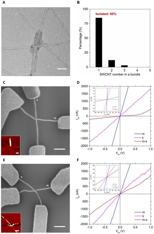 圖1. 單根分散、具有碳焊結(jié)構(gòu)的SWCNT網(wǎng)絡(luò)。(A)典型TEM照片;(B)單根SWCNT的百分含量統(tǒng)計;(C-D)無碳焊結(jié)構(gòu)的金屬性-半導(dǎo)體性SWCNT的I-V傳輸特性;(E-F)有碳焊結(jié)構(gòu)的金屬性-半導(dǎo)體性SWCNT的I-V傳輸特性。