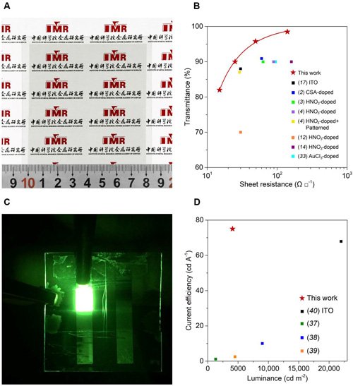 圖2. SWCNT 柔性透明導(dǎo)電薄膜和SWNCT 有機發(fā)光二極管。(A-B)SWCNT 柔性透明導(dǎo)電薄膜的光學(xué)照片及其透明導(dǎo)電性能對比;(C-D)SWCNT 有機發(fā)光二極管原型器件的光學(xué)照片及其光電性能對比。