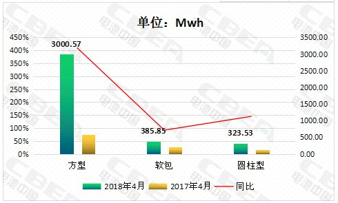 圖3:2018年4月動(dòng)力電池各形狀的裝機(jī)量統(tǒng)計(jì)及同比