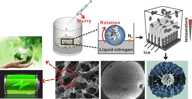 該小組還提出了一種新穎的材料成型方法。受限于成本與生產設備等因素,真空輔助抽濾技術和冰模板法自組裝技術難以實現產業化,無法為我國電子材料產業做出貢獻。因此,曾小亮課題組探索并發明了一種簡易、快速以及宏量制備導熱填料的方法。通過將含有填料的水系分散液直接滴入液氮、結合冷凍干燥以及簡易的自動推進裝置,可以成功構筑三維的氣凝膠球狀填料。這種球狀填料具有大的孔隙率和比表面積,直接參與到導熱網絡的構建當中,可以有效地提高復合材料的導熱性能,在自動推進裝置的輔助下可以實現實驗室規模的小批量生產。此外,這種特殊的微觀結構在吸附及能源領域也表現出巨大的應用潛力。相關論文Liquid nitrogen driven assembly of nanomaterials into spongy millispheres for various applications(《液氮驅動制備多功能三維氣凝膠球》)在線發表于期刊Journal of Materials Chemistry A(DOI: 10.1039/C8TA00310F)。