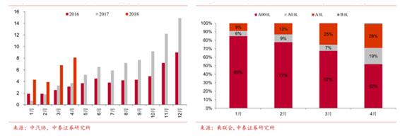 從銷量結(jié)構(gòu)來看,1-4月份乘用車銷量結(jié)構(gòu)中A0級和A級電動車銷量占比出現(xiàn)顯著增加,A0級及以上車型占比已由1月份的15%提升至4月份的47%。