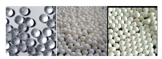 玻璃珠(左)、氧化鋯珠(中)、硅酸鋯珠(右)