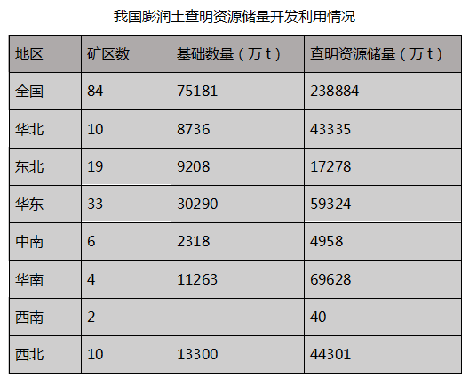 據預測,我國膨潤土礦資源儲量已超過80億噸,為新產品的開發和研究、市場的開拓、競爭力的提高等奠定了資源基礎。我國的膨潤土礦絕大多數是鈣基土礦,平均品位相對較高,埋藏淺,易于開采。