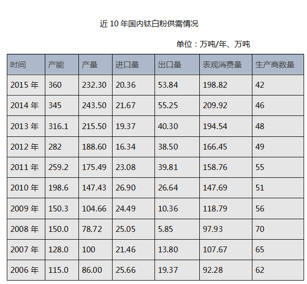 截至2009年底,全球鈦白粉總產能為570萬噸/年,國外的鈦白粉發展較慢,平均每年增幅為3%—5%。2010年全球多家鈦白粉廠被關停,其中,美國關閉了3家,西歐關閉了3家,東歐關閉了2家。而2009—2011年間,國內鈦白粉產以每年30%的增長幅度快速彌補了上述缺口,2013年國內產能一舉突破300萬噸/年大關。2013年以后,產能增幅開始減緩,2014年增幅降至9.2%,2015年降至4.3%,產能增幅已逐步回歸到與經濟增長相適應的水平 。