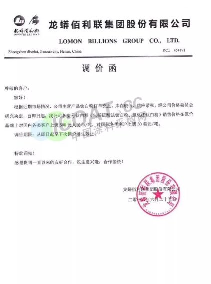 中國粉體網訊 前段時間,龍蟒佰利聯、中核鈦白等各大鈦白粉龍頭企業都有封單的動作,據涂料采購網最新消息,龍蟒佰利聯已率先發布提價通知稱,根據近期市場情況,公司主營鈦白粉訂單充足,庫存較低,供應緊張。經公司價格委員會研究決定,自6月25日起,公司各型號鈦白粉(包括硫酸法鈦白粉、氯化法鈦白粉)銷售價格在原價基礎上對國內各類客戶上調500元人民幣/噸,對國際各類客戶上調50美元/噸。調價通知如下: