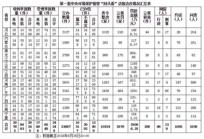 截至6月25日晚20:00,6個督察組共收到群眾舉報29245件,受理有效舉報24246件,經梳理合并重復舉報,累計向被督察地方轉辦交辦23087件;各被督察地方完成查處12409件,其中立案處罰2579家,罰款25096萬元;立案偵查208件,拘留235人;約談1065人,問責1939人。但從各被督察地方報送情況看,廣東群眾舉報辦結率偏低;黑龍江、河南群眾舉報不實問題占比較高;廣西、寧夏尚無因環境違法犯罪而拘留的人員。這些需要引起當地黨委、政府高度重視。