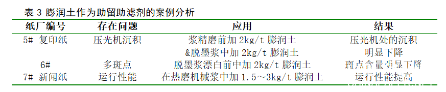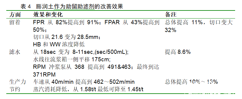 相比于十年前,現代造紙工業更加注重節約用水。部分制漿造紙過程采用封閉水循環,即造紙廢水的“零”排放理念。但“零”排放理念帶來的問題是,當新鮮水補給減少時,陰離子垃圾和無機廢料達到飽和。從而造成了TOC含量和電導率的升高,這兩者的升高又進一步導致了紙機運行性能的變差。事實證明,能有效解決這一問題的微小顆粒是膨潤土。表3為膨潤土提高紙機運行性能的幾個案例。