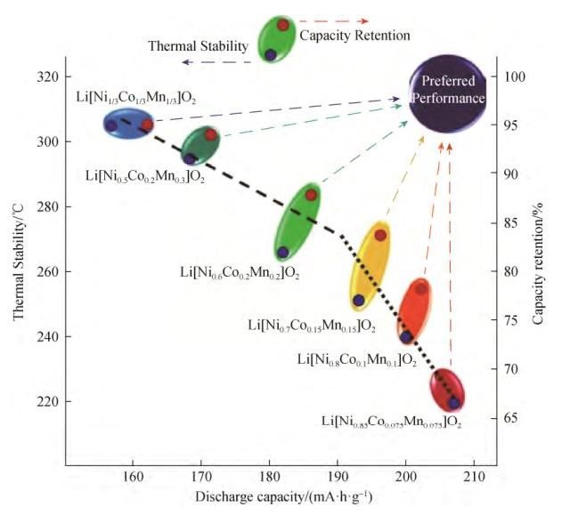 圖1:Li[NixCoyMnz]O2(NCM,x=1/3, 0.5, 0.6, 0.7, 0.8, 0.85)的放電容量、熱穩定性和容量保持率關系圖