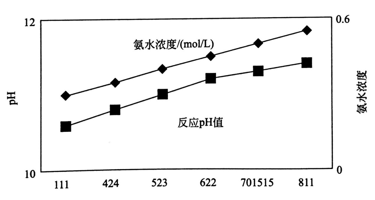 氨水是反應絡合劑,主要作用是絡合金屬離子,達到控制游離金屬離子目的,降低體系過飽和系數,從而實現控制顆粒長大速度和形貌。所以制備不同組成的三元前驅體,所需的氨水濃度也不同。