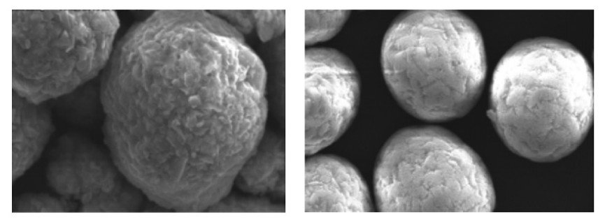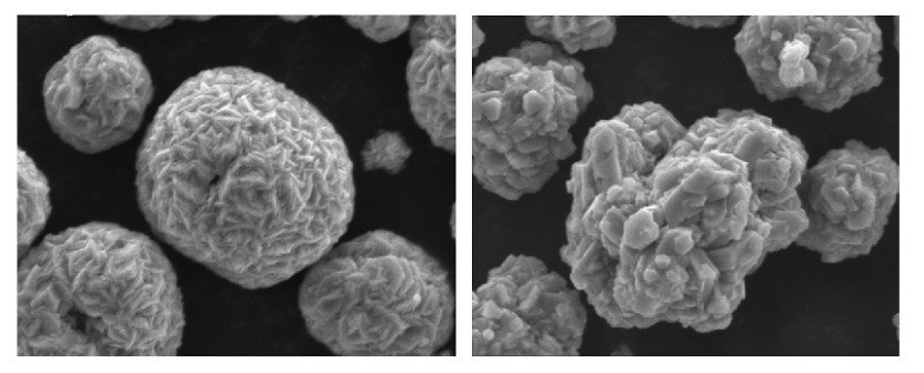 圖8:不同固含量條件下生產高鎳811前驅體SEM(左:固含量低,右:固含量高)
