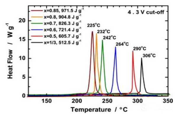 隨著NCM能量密度的不斷提高,材料的熱穩(wěn)定性會越來越差。下圖表述的是隨著Ni含量的升高材料的分解溫度逐漸下降。