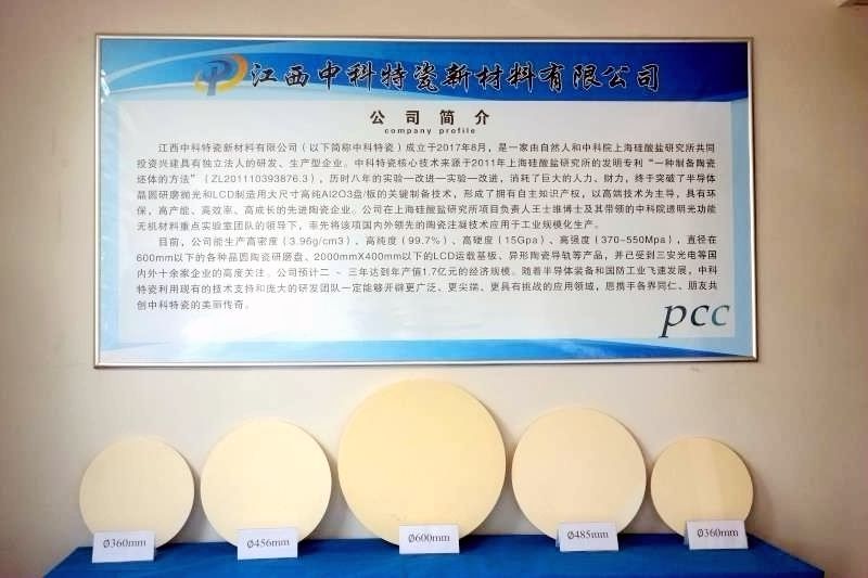 近五年來,該研究團隊在材料及陶瓷類國際期刊上發表PIBM自發凝固成型相關的研究論文20余篇,核心技術獲得授權中國發明專利6項。自報道以來,PIBM自發凝固成型體系引起國內外同行的廣泛關注。同時,該研究團隊一直致力于新型成型技術推廣應用工作。2017年7月,以新型PIBM自發凝固體系為技術核心,上海硅酸鹽所與江西萍鄉企業聯合成立了江西中科特瓷新材料有限公司,開展大尺寸高純氧化鋁陶瓷部件的產業化工作。目前,該公司建成了中試生產線,掌握了自發凝固成型大尺寸氧化鋁研磨盤的干燥、脫粘和高溫燒結等關鍵技術,制備了直徑360mm-600mm多種規格的高純氧化鋁研磨盤,為規模化生產奠定了堅實基礎。