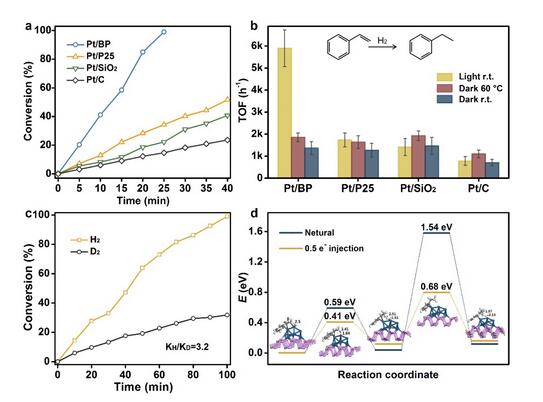 (a) 不同催化劑光催化苯乙烯加氫性能轉化率對比;(b) 黑磷/鉑光催化和熱驅動苯乙烯加氫性能轉化率對比;(c) 黑磷/鉑在苯乙烯加氫中觀察到的主要同位素效應;(d) 光電子對苯乙烯加氫能壘變化影響