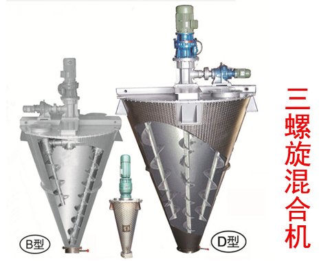 錐形三螺旋混合機(4m3以上):在原雙螺旋錐形混合機基礎上系統進行創新改進,增加一條螺旋,混合故障率極低、采用兩條對稱排列螺旋及中間一條長螺旋順轉,原長螺旋斜度大、壓力大、今縮短螺旋長度牢固,增加螺旋的強度,使得三條螺旋比現有的雙螺旋運行更加的穩定,螺旋越多,混合效果越明顯,混合精度更高,提高生產率,保證質量,使設備壽命增長。采用該系列機提升混合效果,解決了用戶對特輕、特細物料難以混合均勻的困難,同時對一般物料速度、精度均有明顯提高,減少混合時間,具有節能意義,特別適用于大容積4m3以上機型的物料混合。